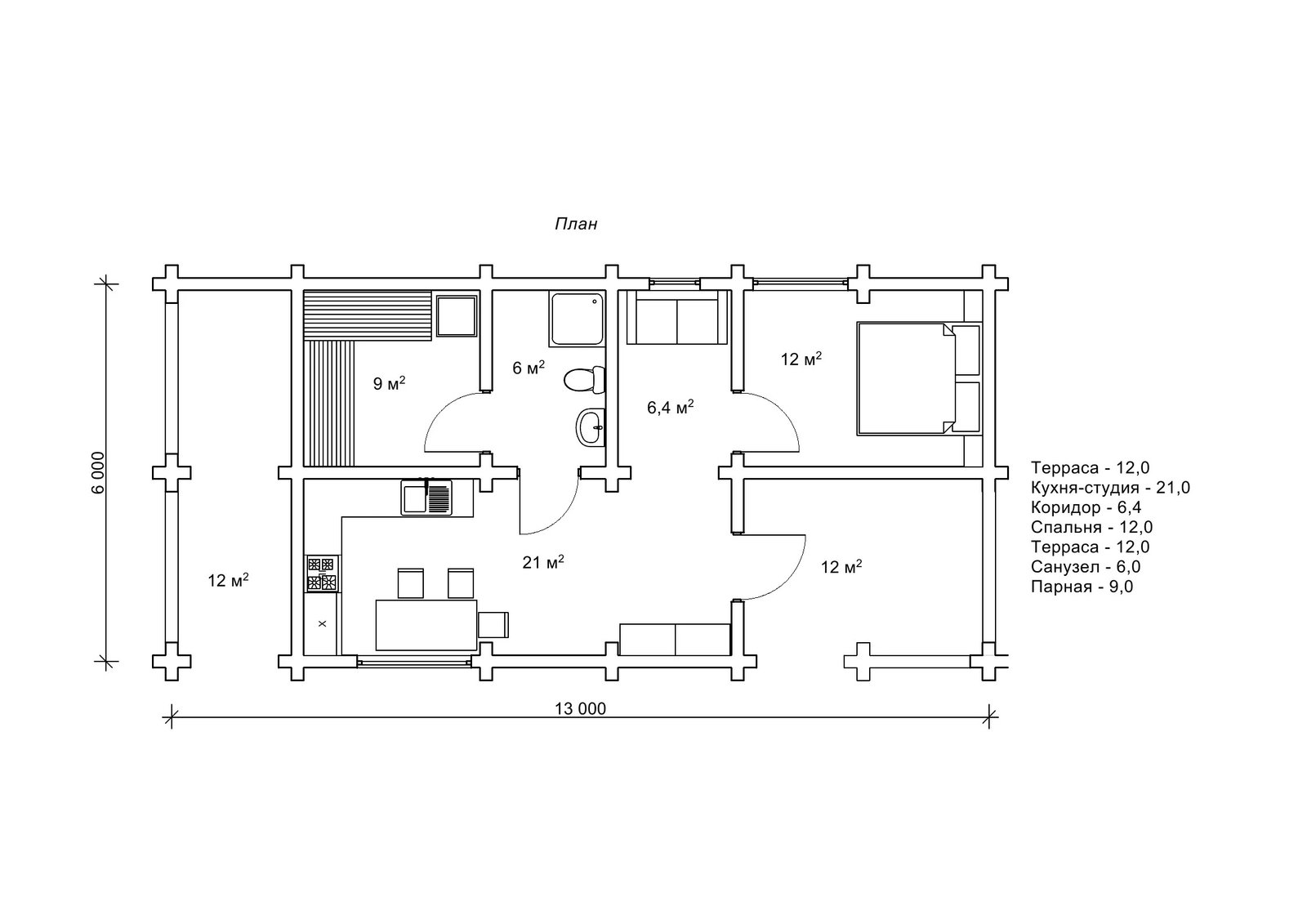 Срубът на банята е проектиран в параметри 6х13 м, заемащи площ от 78 м². Вътре се намира просторна кухня-студия, която осигурява достатъчно място за работни повърхности, обедна маса и уютен кът за отдих. Отделна спалня с площ от 12 м² прави проектът „Белонна“ подходящ не само за баня, но и като пълноценна вила. Важно е да се отбележат и големите размери на парилнята – 9 м², което позволява едновременно да се намират повече от десет души. Това прави проекта подходящ и за търговска употреба, като може да се използва в курортни комплекси или за допълнителни услуги. Добре обмисленото разпределение на банята „Белонна“ я прави универсална за различни функционалности и я превръща в отличен избор както за частни, така и за бизнес цели.