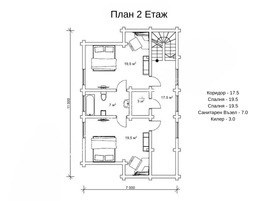 На първия етаж са разположени входно антре, просторна всекидневна, кухня, спалня, санитарен възел и баня. Отпред има малка лятна тераса – идеално място за сутрешно кафе или следобедно чайче на открито. Вторият етаж предлага още две спални, втора баня с вана, складово помещение и коридор с достъп до останалите стаи. Този проект е отличен избор за семеен дом в покрайнините или в тиха вилна зона.