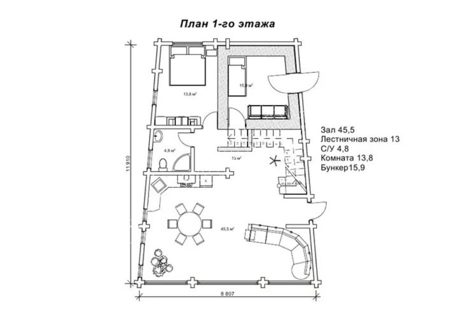 Първият етаж включва просторна дневна с площ от 45,5 кв.м, две стаи съответно по 15,6 кв.м и 13,8 кв.м, стълбищна зона – 13 кв.м, както и санитарно помещение – 4,8 кв.м. Просторното вътрешно разпределение осигурява комфорт и функционалност за цялото семейство.