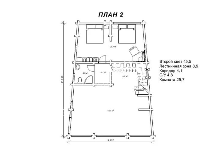 На втория етаж се намира голямо светло помещение с площ от 29,7 кв.м, проектирано като спалня с две отделни легла, както и допълнителен санитарен възел с площ 4,8 кв.м. Стълбищната зона на етажа заема 8,9 кв.м.