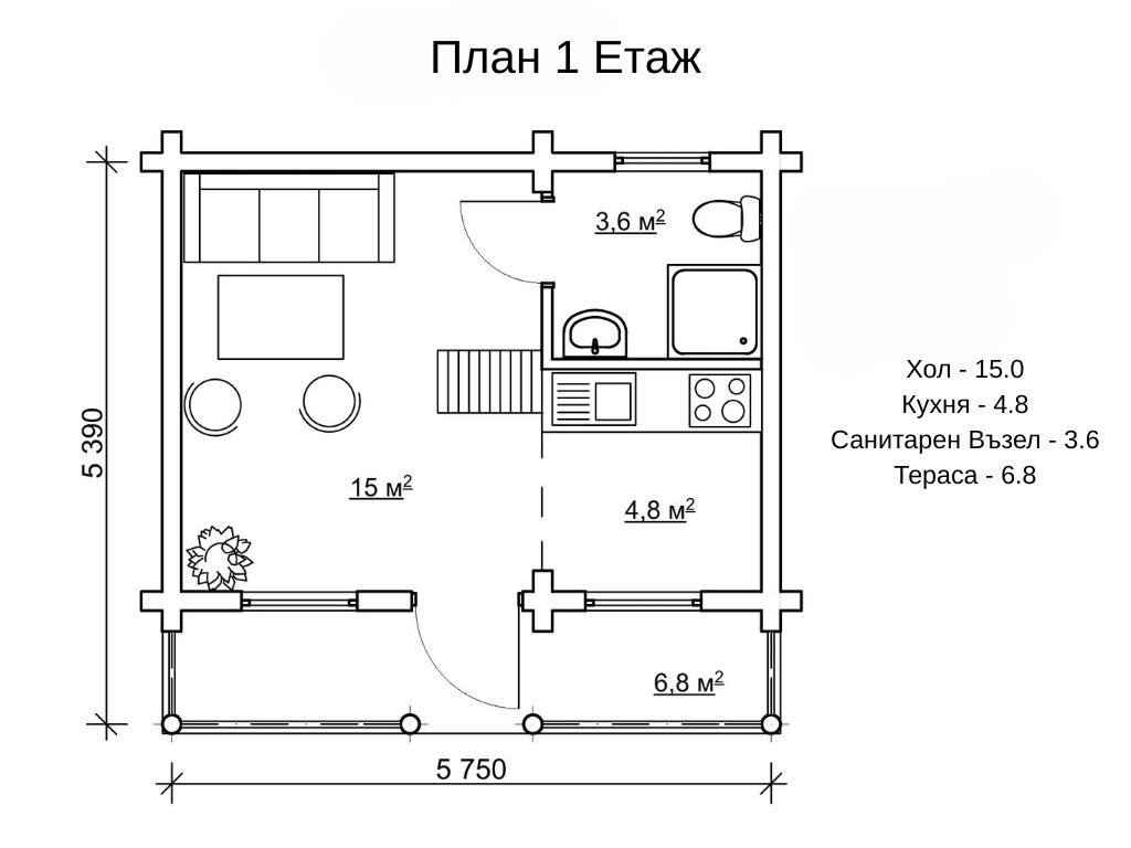 Двуетажната конструкция с мансарда е с компактни размери — 5,3 х 5,7 м, но на обща площ от 41 м² предлага всичко необходимо за удобен престой през всички сезони. На първия етаж са разположени дневна с кухненски кът и баня. От малката тераса пред входа може да се насладите на чистия въздух или на чаша чай сред природата.