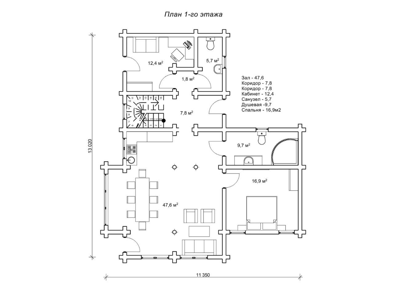 Разпределение на вилата от цилиндрични трупи – 13 × 11,3 м