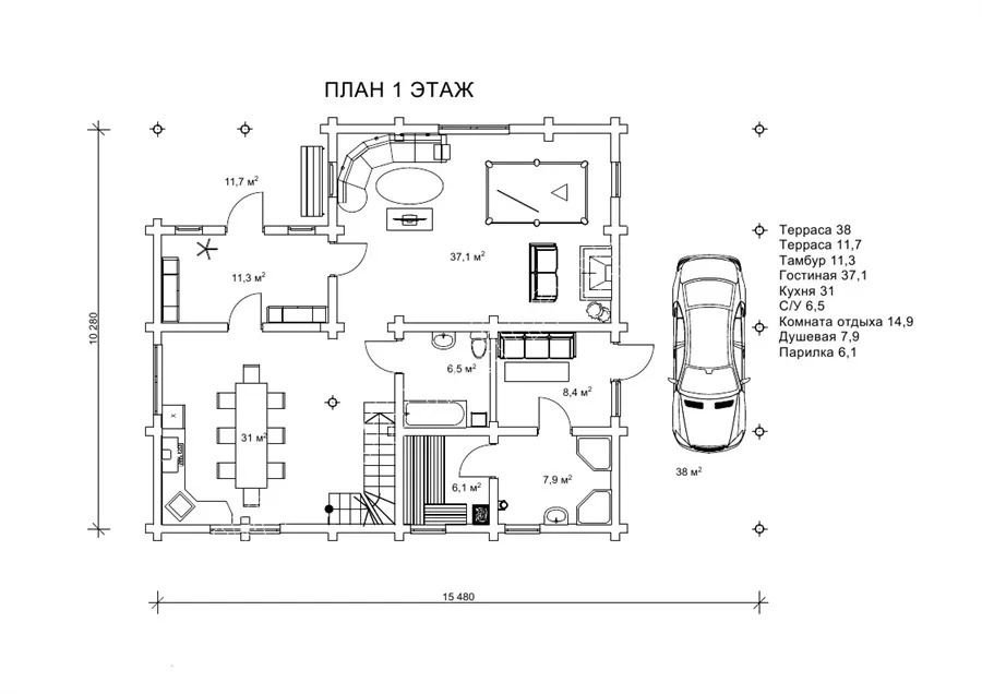 Вътрешното разпределение на първия етаж включва входно антре, просторна дневна, кухня, санитарен възел, парна баня и душ зона. Едно от най-големите предимства на проекта е възможността да се насладите на релаксиращи парни процедури, без да напускате дома. Всички помещения, свързани с банята, са обособени в отделна функционална зона, така че да не нарушават спокойствието на останалите членове на семейството. В голямата дневна има достатъчно място за билярдна маса, а кухнята е проектирана така, че да побере просторна трапезарна маса за семейни вечери и гости.