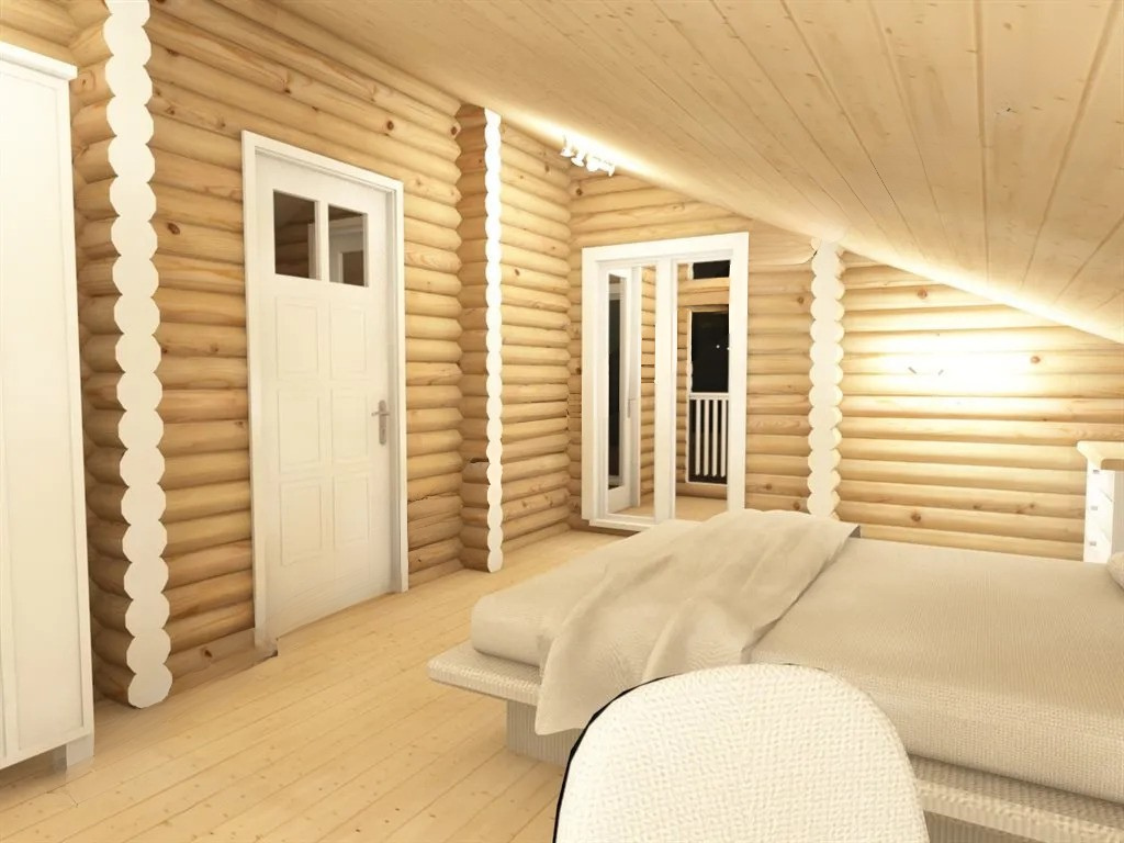 Къщата „Ноема“ е изработена от цилиндрични трупи в класически стил с мансарда (полуетаж) и балкон. Простият двускатен покрив, стените в мек светлокремов нюанс и големите прозорци придават на дома изискан и приветлив външен вид. Дървеният дом „Ноема“ излъчва топлина и уют – само с един поглед към него се усеща свежестта и естественият аромат на иглолистна дървесина. Той е идеален избор за тези, които ценят природата и желаят да живеят сред естествени материали.