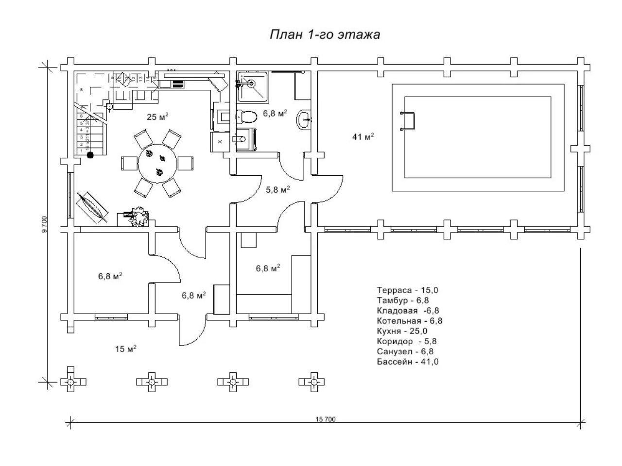 Най-вълнуващата част от проекта е, разбира се, помещението с басейн — цели 41 м² водно удоволствие, отделено от жилищната зона чрез коридор, който предпазва останалите стаи от влажността. На първия етаж се намират още баня и котелно помещение. Планировката е интелигентно обмислена — предлага простор, функционалност и удобство за съвременен начин на живот.