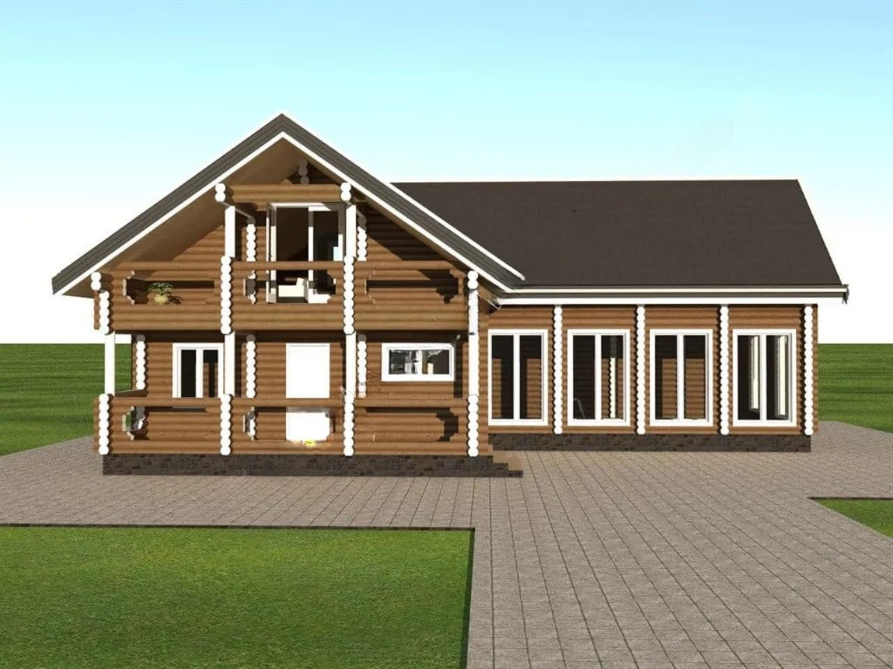 Впечатляващата дървена резиденция „Тангора“ очарова с просторни панорамни прозорци, живописни балкони и стабилни стени от масивен дървен материал. От пръв поглед вниманието привлича страничното крило на сградата — голямото остъклено пространство подсказва, че там може да бъде изграден зимна градина, уютна веранда или дори помещение с басейн.