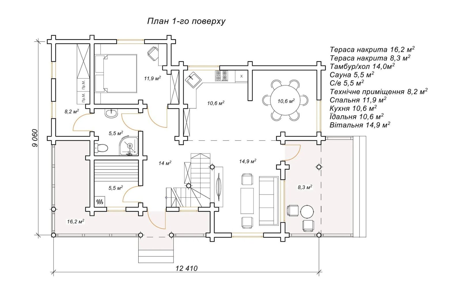 На първия етаж са разположени просторна дневна, кухня, спалня, санитарно помещение и техническо помещение. Важен акцент в проекта е наличието на сауна, която осигурява възможност за пълноценен релакс и наслада от банни процедури, без да напускате дома си.