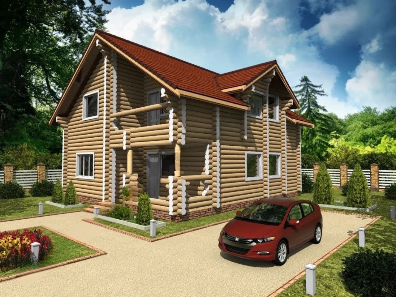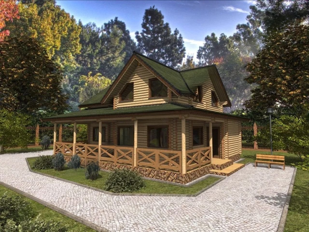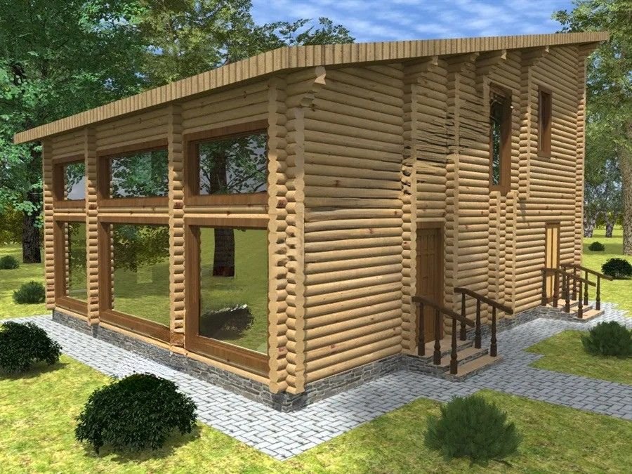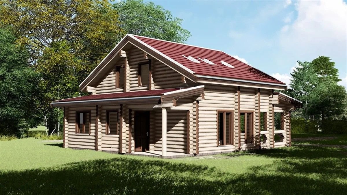Дървена къща от цилиндрични трупи с тераса Проектът...